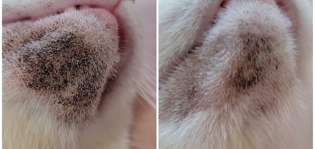 Thứ hai, sự xuất hiện của những vệt đen có thể là một trong những dấu hiệu rõ rệt của viêm da tuyến bã nhờn. Những vệt này thường xuất hiện tại các vùng như mặt, cổ, và gáy, thường đi kèm với sự mất lông tại những khu vực này. Sự đổi màu da này là kết quả của sự tích tụ bã nhờn và quá trình viêm, là một biểu hiện rõ ràng cho thấy tình trạng sức khỏe của mèo đang gặp vấn đề.